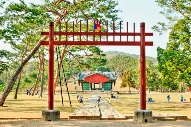 2. 홍살문(紅箭門): 속세와 성역을 나누는 입구. 붉은 칠은 사악한 기운을 막는 의미를 지니며, 두 개의 화살살은 신성한 공간의 경계를 뜻합니다.